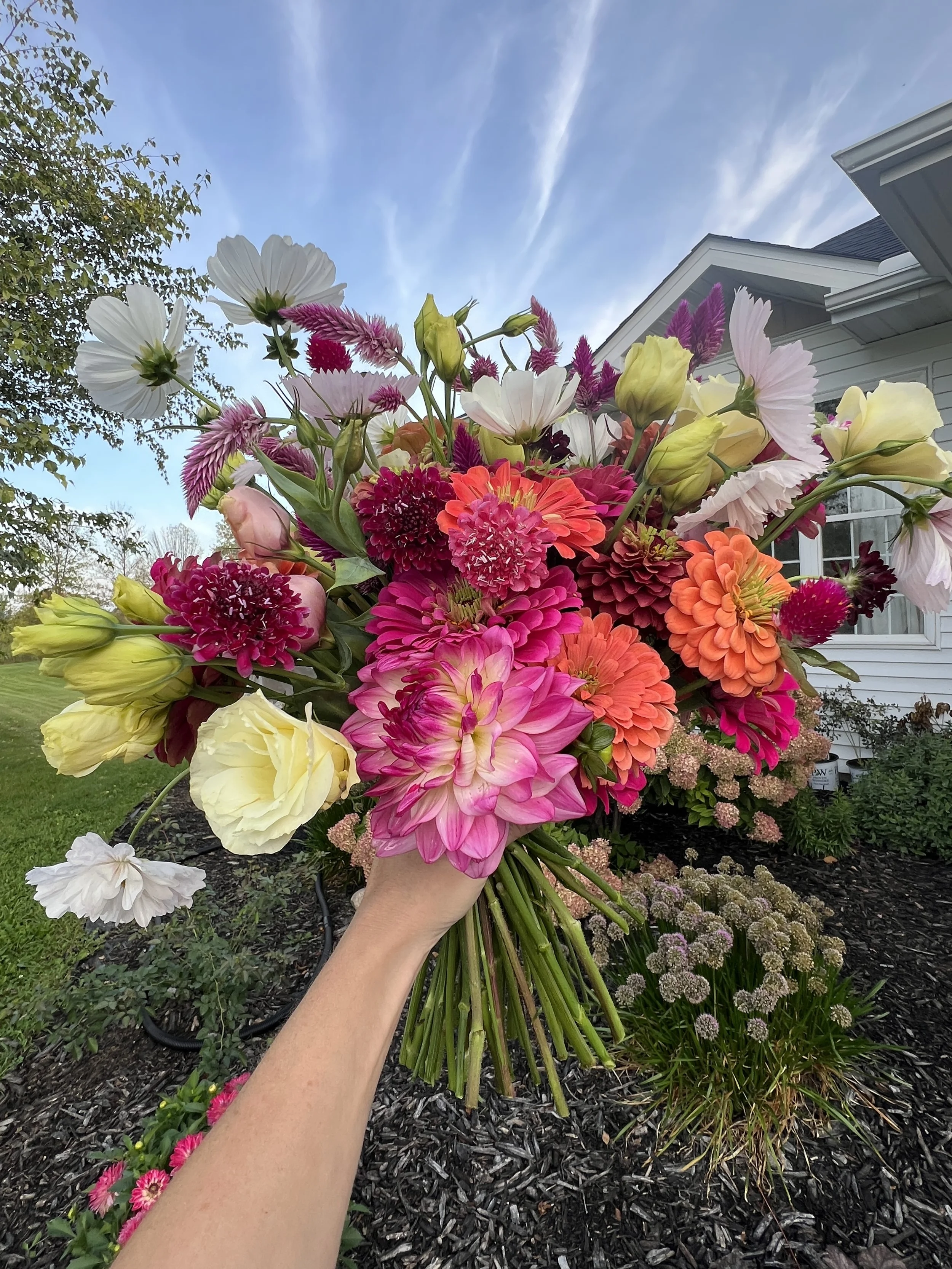 Each bucket includes 50–70 stems of mixed focal flowers, airy textures, and greenery. Bloom Buckets are growers choice and filled with the best of what’s growing.Perfect for small events, gatherings, or adding garden‑grown beauty to your home. $95–$125 per bucket.